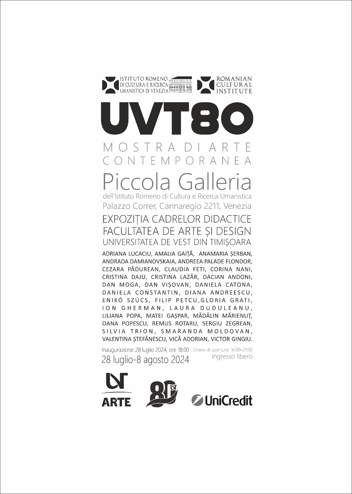 L’Istituto Romeno di Cultura e Ricerca Umanistica di Venezia organizza, in collaborazione con l’Università dell’Ovest di Timişoara e l’Unione degli Artisti Visivi di Romania – Filiale di Timişoara, dall’28 luglio al 8 di agosto 2024, presso la Piccola Galleria, la mostra di arti visive «UVT 80» dei docenti della Facoltà di Belle Arti e Design dell’Università dell’Ovest di Timişoara, a cura di Remus Rotaru.