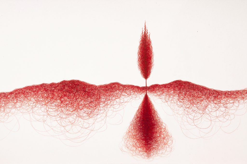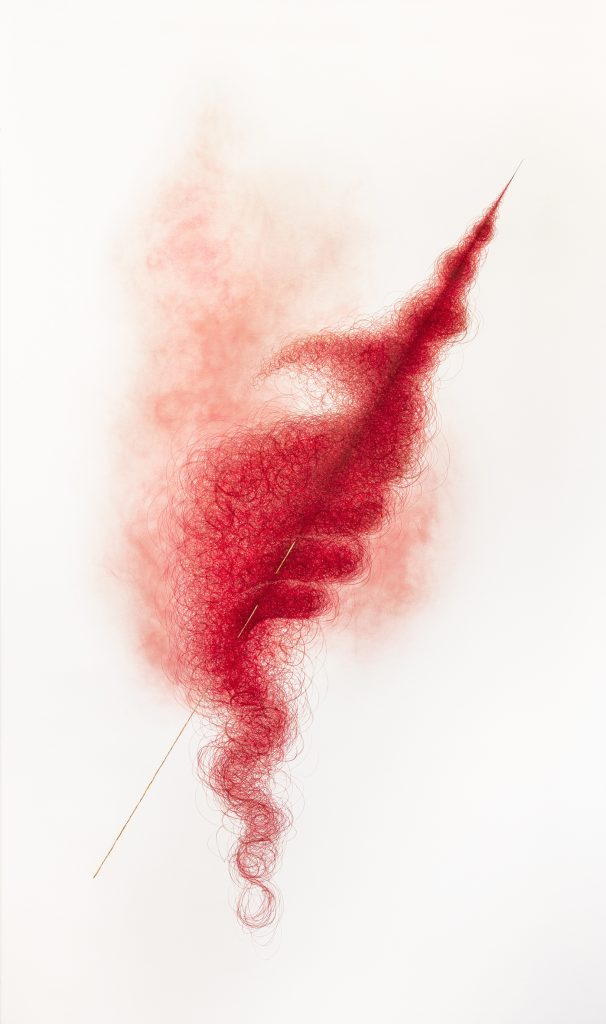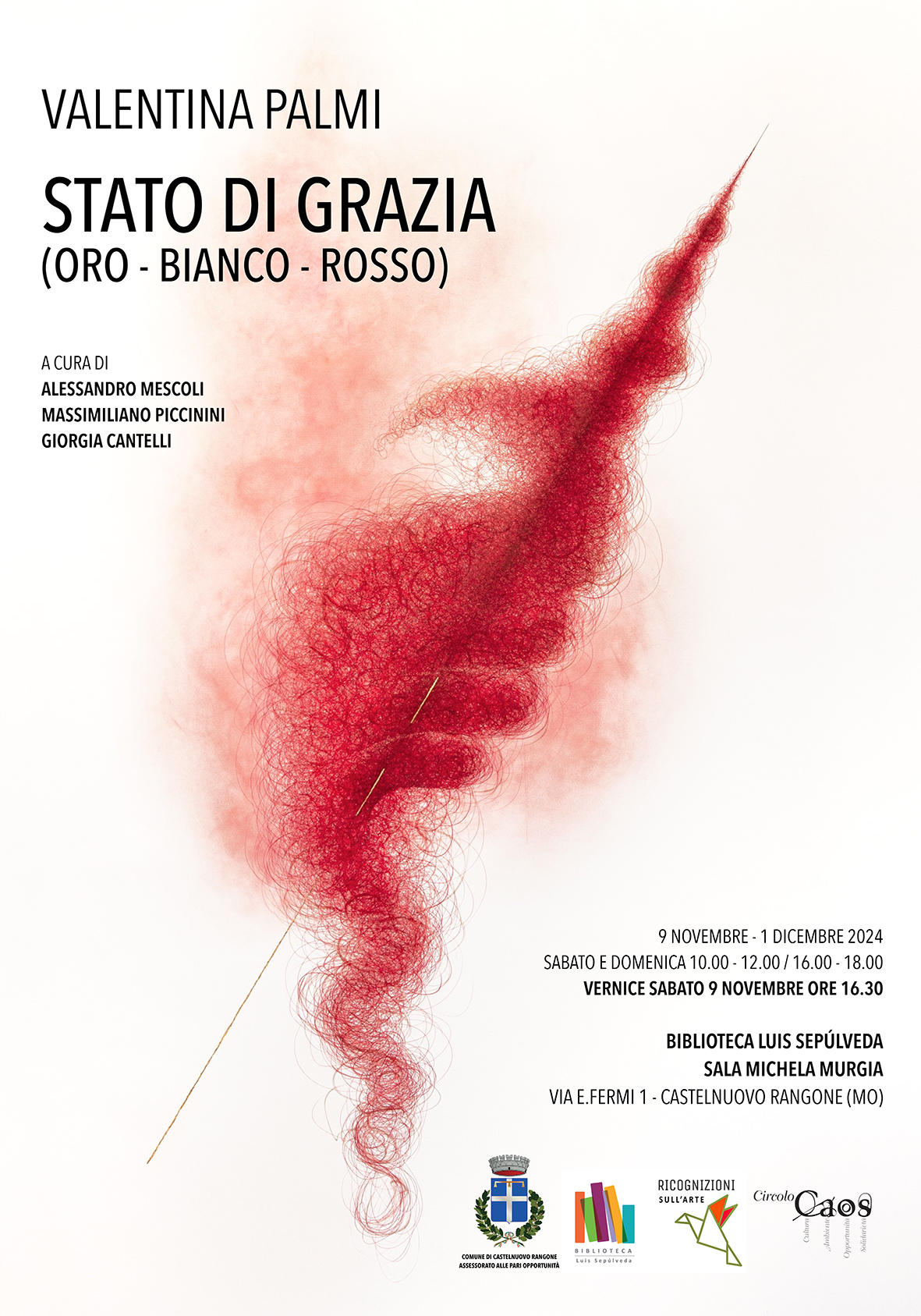 Stato di grazia è un viaggio ideale verso un paese utopico che, con un gioco di parole, diventa uno straordinario stato interiore, uno stato dell’essere. Come ogni paese che si rispetti, anche lo Stato di grazia possiede la sua bandiera: un vorticoso tricolore oro, bianco, rosso. I colori che impregnano la mostra sono fortemente simbolici e rappresentativi della mia ricerca: l’Oro della spiritualità e della perfezione della coscienza, il Bianco per la rappresentazione del Vuoto, il Rosso del Sangue e del Fuoco, rappresentante dell’Energia e dell’Anima