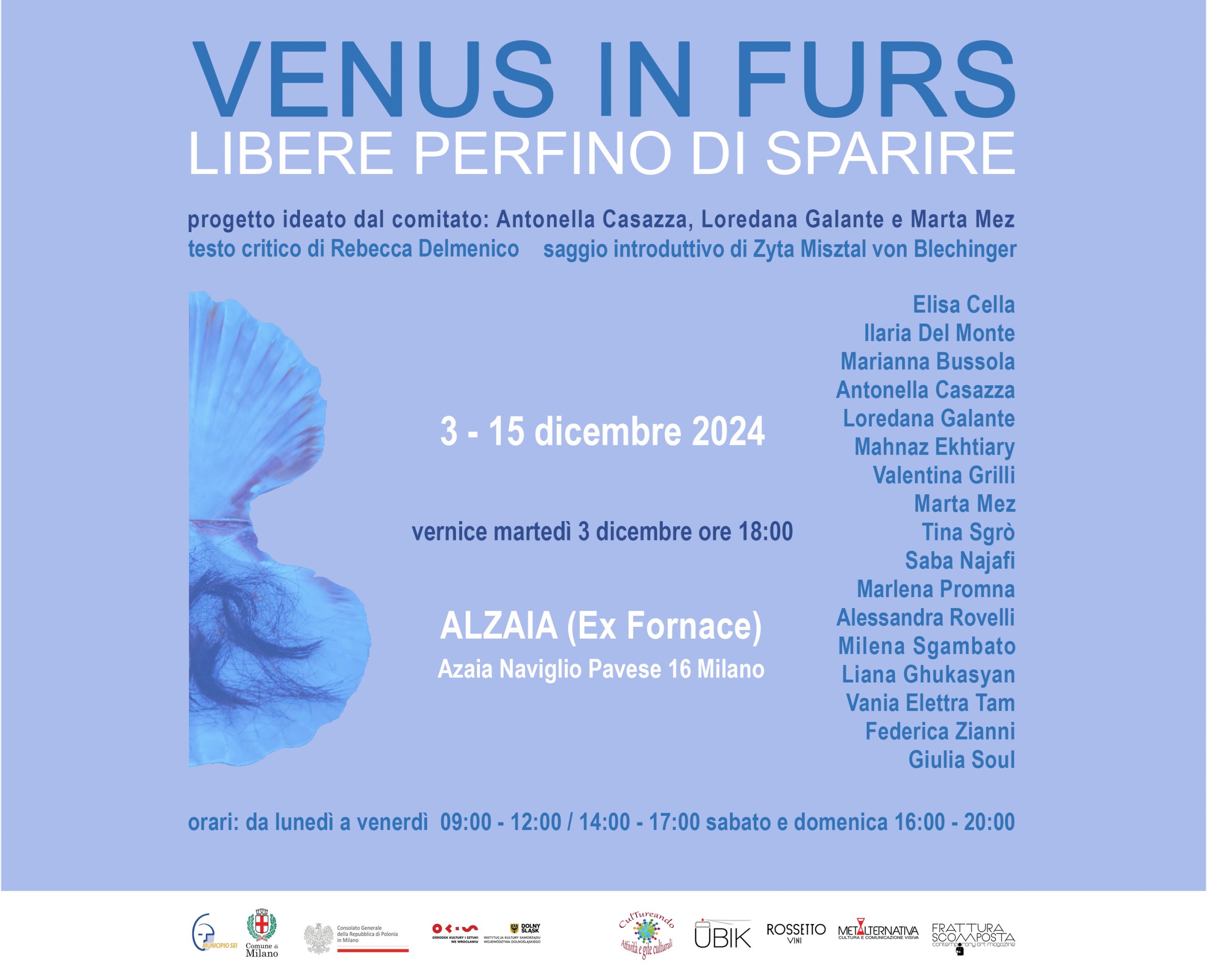 VENUS IN FURS – LIBERE PERFINO DI SPARIRE dal 3 al 15 dicembre 2024 ad Alzaia (Ex Fornace - Naviglio Pavese 16 – MI), propone un confronto diretto e personale sul tema della discriminazione di genere. La mostra nasce dall’iniziativa delle artiste Loredana Galante, Antonella Casazza e Marta Mez.