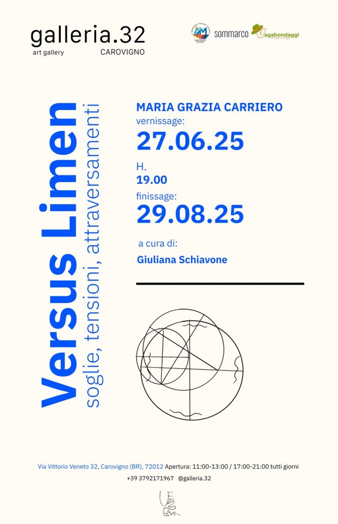 Il 27 giugno alle ore 19.00, presso la Galleria 32 di Carovigno (Br), si inaugura “Versus Limen, soglie, tensioni, attraversamenti”, personale dell’artista Maria Grazia Carriero a cura di Giuliana Schiavone.