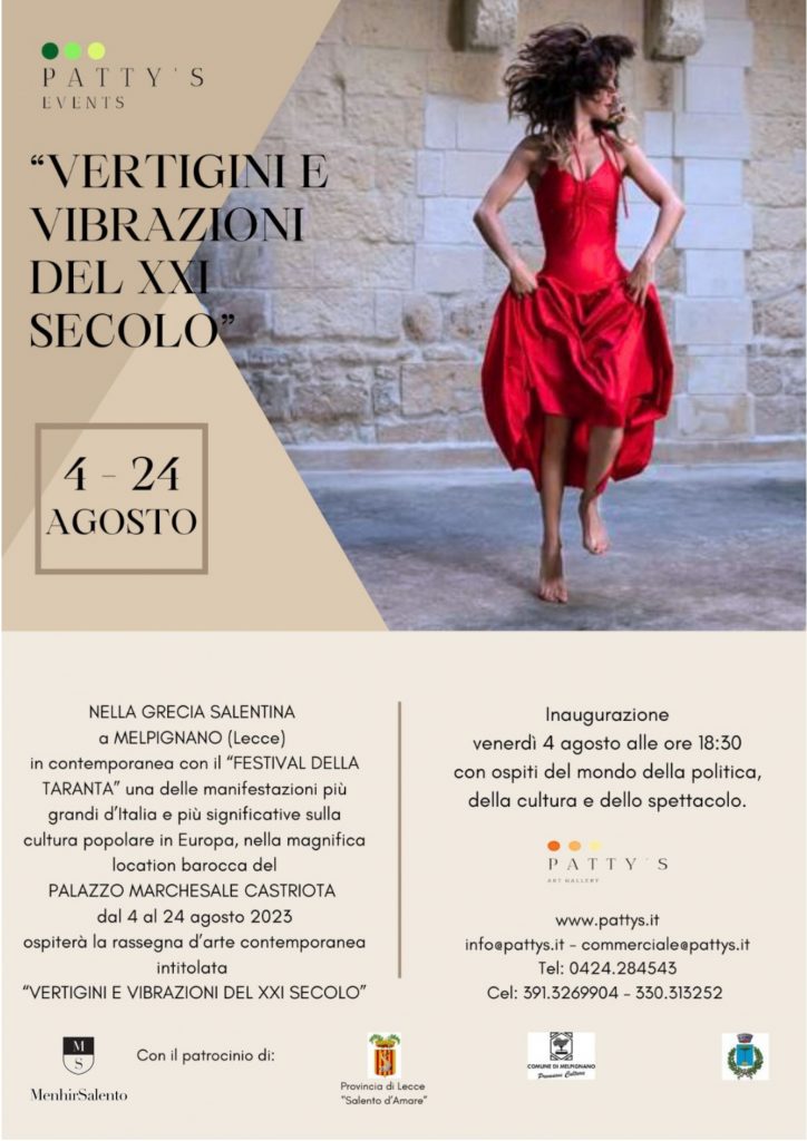 “Patty’s Art Gallery ha pensato di organizzare una prestigiosa rassegna d’arte nel Salento, terra di tradizioni e di cultura, nel cuore della Grecìa salentina e più precisamente a Melpignano, dove da anni in agosto si svolge uno dei festival musicali più importanti d’Italia” spiega la direttrice della galleria Patrizia Stefani. “‘Vertigini e vibrazioni del XXI secolo’ troverà la culla ideale tra le mura e nelle stanze del magnifico Palazzo Marchesale Castriota. Accompagnati dal ritmo vertiginoso della Taranta, antico ballo salentino, porteremo in mostra validi artisti che, attraverso la loro creatività, sapranno offrire nuove letture e prospettive attuali in una terra misteriosa, unica e affascinante”.