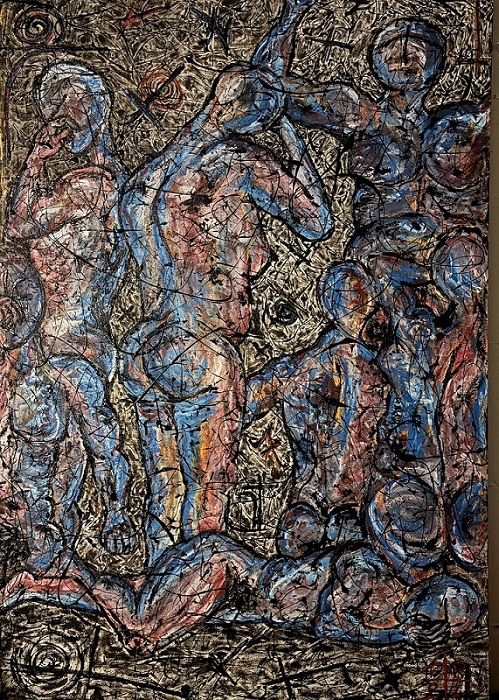 La ricerca della perfezione nell’imperfezione, il contrasto di corpi e figure appena abbozzate che sembrano emergere dalla juta, la forza materica dell’asfalto, l’uso di materiali inconsueti e non convenzionali, un accenno di astrattismo con riferimenti neoespressionismo di Jean Michel Basquiat, queste sono le caratteristiche pittoriche di Francesco Patanè.