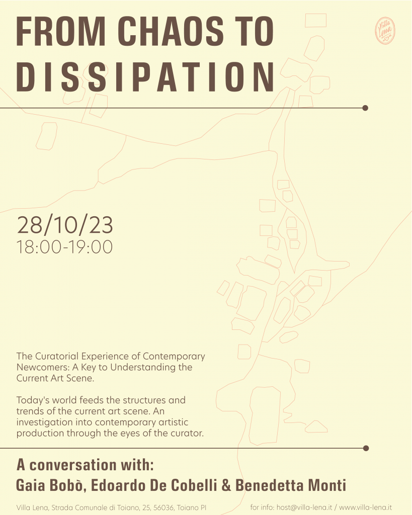 Inoltre, il Sabato, a precedere la performance musicale, si terrà, sempre negli spazi della Villa, sede della Fondazione e casa per gli artisti per il loro periodo di residenza, la conferenza in inglese dal titolo "From Chaos to Dissipation", che coinvolgerà i curatori Gaia Bobò ed Edoardo De Cobelli e sarà moderata dalla curatrice in residenza Benedetta Monti. Felici di ospitare giovani personalità del panorama curatoriale italiano, dopo un breve rinfresco, la conversazione tra i tre mirerà a coinvolgere il pubblico in un'analisi dell’esperienza artistica e curatoriale, e dell’interazione tra le due.