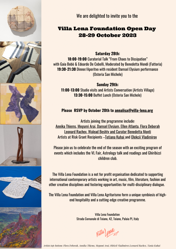 Dedita al sostegno di artisti internazionali che si interessano e lavorano nella varietà più diffusa delle discipline artistiche e culturali, la Villa Lena Foundation ogni mese organizza un Open Day per coinvolgere addetti al settore ed amatori in una giornata o più di interesse culturale contemporaneo. I residenti, che cambiano ogni mese, lavorando ognuno nel proprio studio, che può essere condiviso fino a un massimo di due persone, aprono le porte dei loro spazi per mostrare i progressi e progetti portati avanti in residenza presso la Fondazione. Inoltre, la giornata è solitamente accompagnata da un evento musicale a cura del musicista in residenza, e così sarà anche per questa due giorni: nella serata di Sabato 28 Ottobre Damsel Elysium suonerà all'interno della Villa storica per il pubblico che sarà libero di esplorare gli spazi ascoltando la musica, suonata dal vivo, che cambia di sonorità a seconda del punto di ascolto. La performance sarà anche testimonianza della collaborazione tra Damsel e alcune degli artisti in residenza, che creeranno il vestito e il velo, nonché la scenografia floreale.