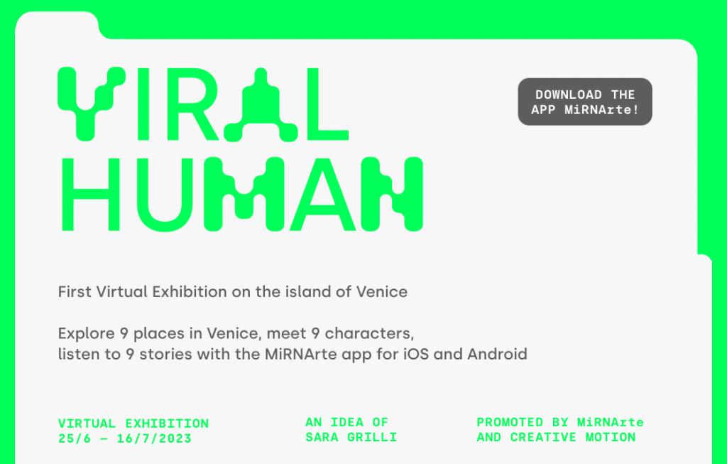 L’installazione site-specific "Viral Human" ideata dall’artista Sara Grilli, per rievocare le origini storiche della Festa del Redentore di Venezia. Fruibile digitalmente attraverso una applicazione mobile dal 25 giugno, "Viral Human" viaggia parallelamente tra due epoche: la Peste del 1575-77 a Venezia e la pandemia di Covid-19.