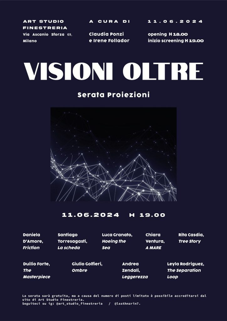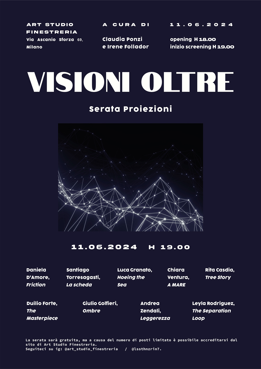 Art Studio Finestreria di Milano è lieta di annunciare l’avvio del progetto VISIONI OLTRE, un ciclo di serate di screening. Martedì 11 giugno alle ore 18.00 la galleria propone una seconda serata con le opere videografiche di artist* che hanno partecipato all’open call. Il progetto è a cura di Claudia Ponzi e Irene Follador. VISIONI OLTRE è un evento in concomitanza della mostra STANZE di Paola Fonticoli che durerà fino al 14 maggio.