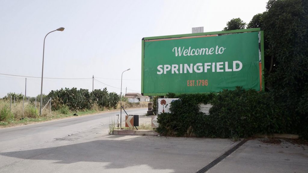 Per un breve periodo di tempo, Springfield sarà in Sicilia. L'insegna che riguarda la famosa sitcom animata statunitense di Matt Groening, è diventata come un'insegna di Los Angeles (la Città degli Angeli). Ma chi ha messo quella enorme scritta lì? Si tratta di un'opera d'arte del giovane artista Joe Stornello, realizzata in occasione del Terzo Paradiso di Michelangelo Pistoletto. Il supporto per manifesti pubblicitari viene trasformato in un benvenuto anomalo: varcando la soglia si entra infatti un un mondo immaginario con chiari riferimenti legati alla cultura popolare. Springfield di Stornello è al contempo un atto di coraggio e una fuga, un'opera d'arte irriverente. Ricreando il mito dei Simpson in Sicilia, l'artista innesca un'esplosione di Interpretazioni.