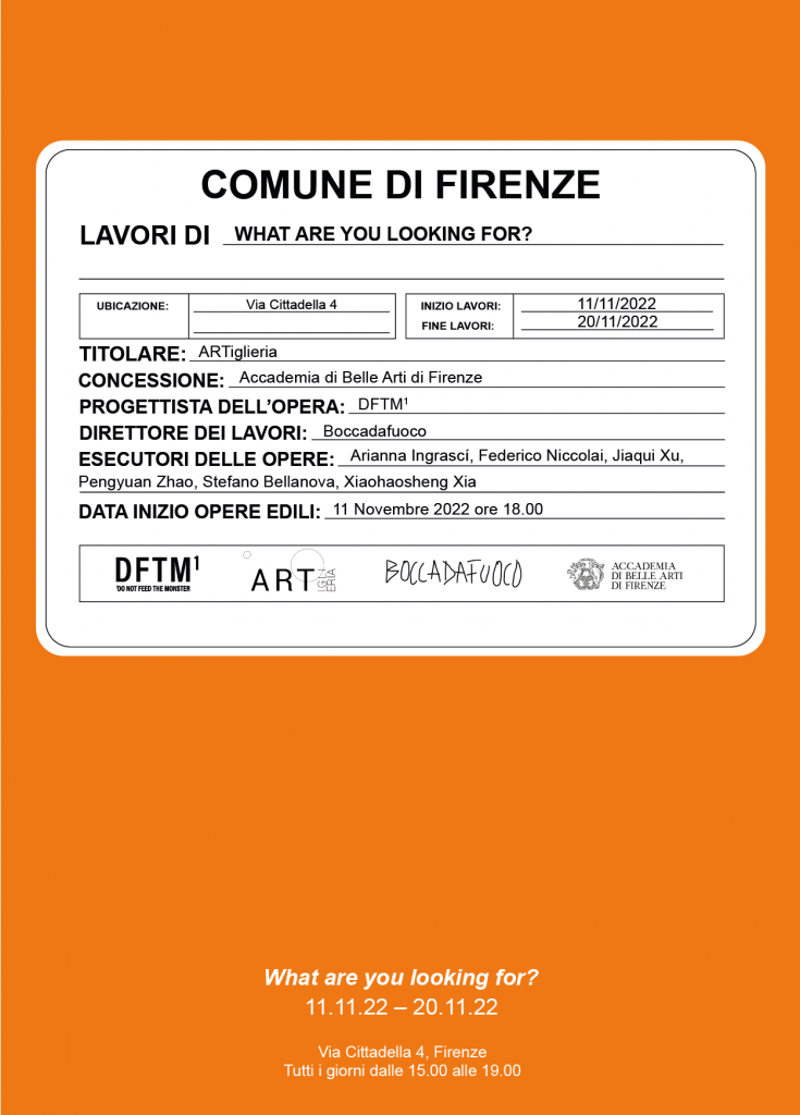 Inaugura l’11 novembre "What are you looking for?" progetto espositivo curato da DFTM¹, un gruppo autogestito di studenti dell’Accademia di Belle Arti di Firenze in collaborazione con la Consulta degli studenti. Il progetto, ospitato dall’associazione culturale ARTiglieria, si colloca nell’ambito dei progetti educativi di BOCCADAFUOCO, creando un dialogo e un luogo di sperimentazione tra spazio ospitante, artisti e giovani curatori con l’intento di mettersi in gioco e di creare delle prospettive in trasformazione sul panorama artistico fiorentino contemporaneo.