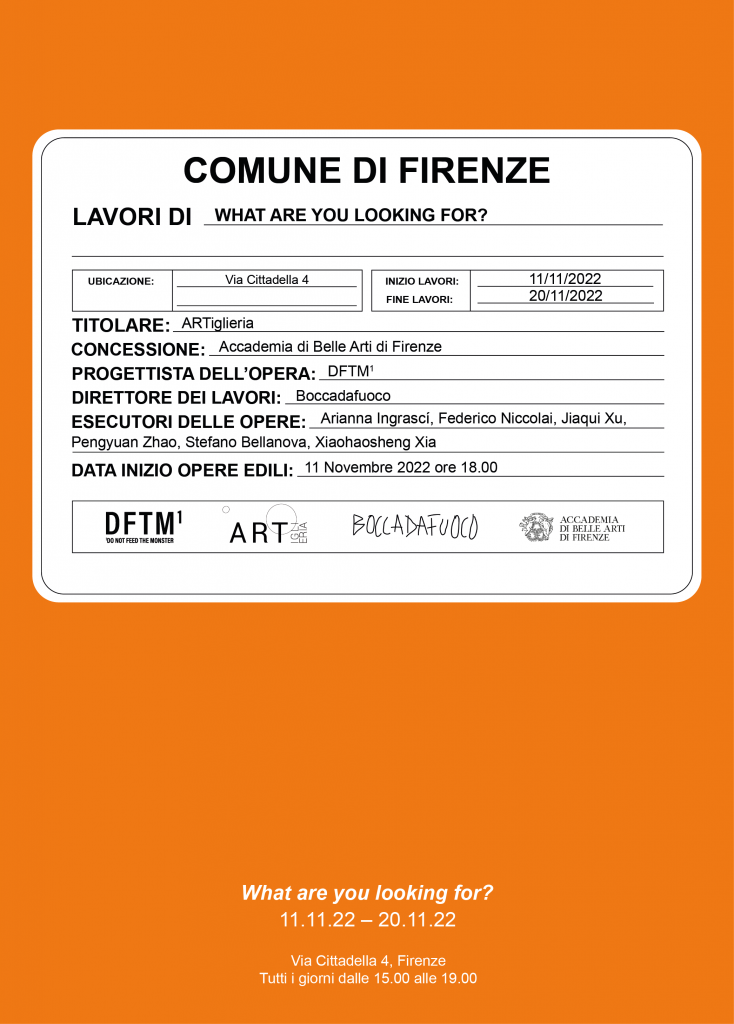 Venerdì 11 novembre 2022 inaugura la mostra dal titolo What are you looking for? a cura del collettivo DFTM1, gruppo autogestito di studenti del biennio di Curatela e Nuovi Linguaggi Espressivi - Grafica dell’Accademia di Belle Arti di Firenze in collaborazione con la Consulta degli studenti.