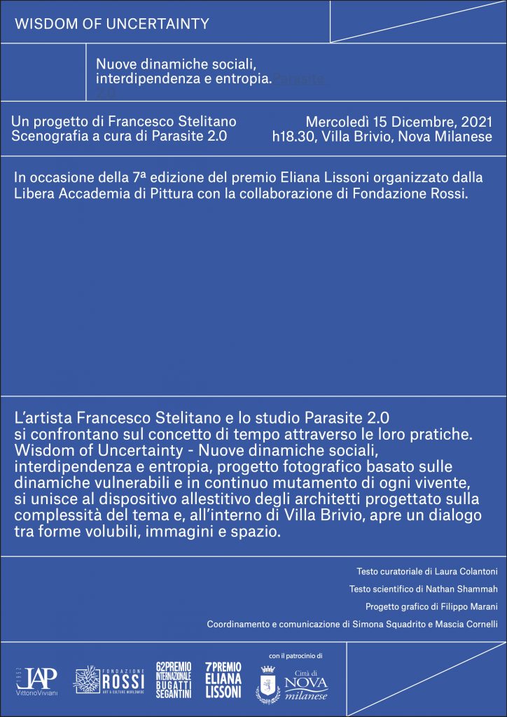 In attesa della settima edizione del Premio di fotografia Eliana Lissoni, siamo lieti di annunciare Wisdom of Uncertainty, un progetto realizzato insieme all’artista Francesco Stelitano e al collettivo Parasite 2.0.  Wisdom of Uncertainty prosegue il discorso avviato con la mostra ADESSO!, realizzata lo scorso ottobre dalla Fondazione Rossi per la sezione speciale e internazionale del 62° Premio Bugatti Segantini.