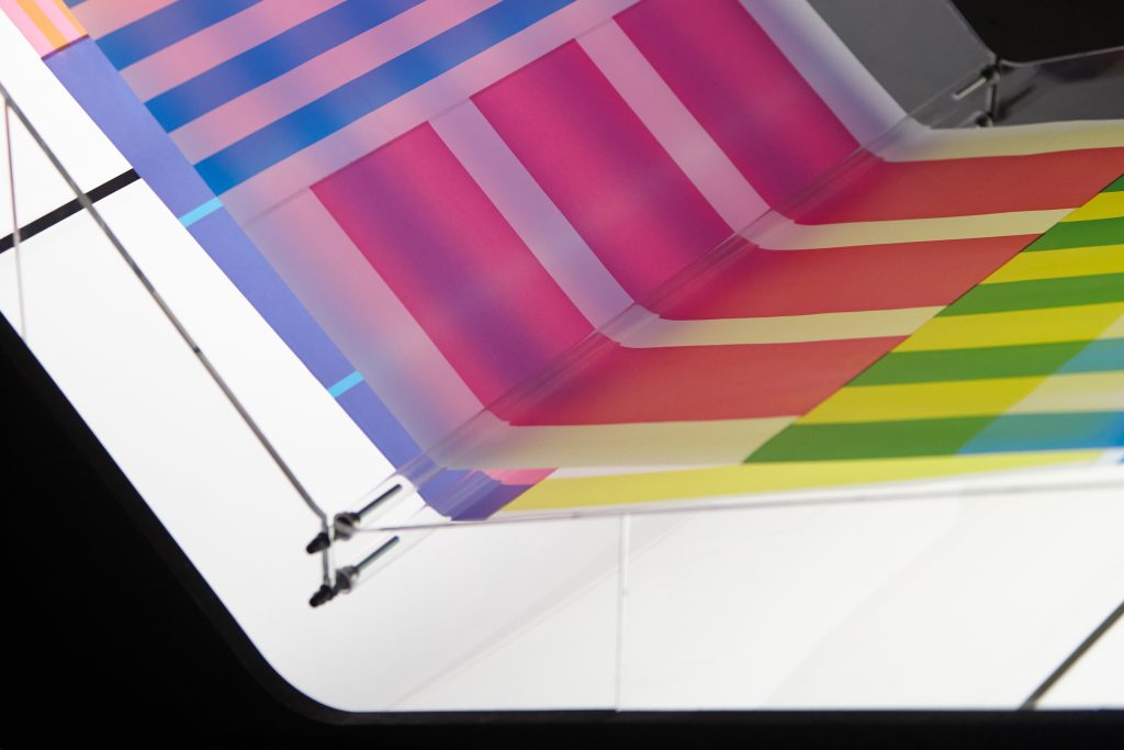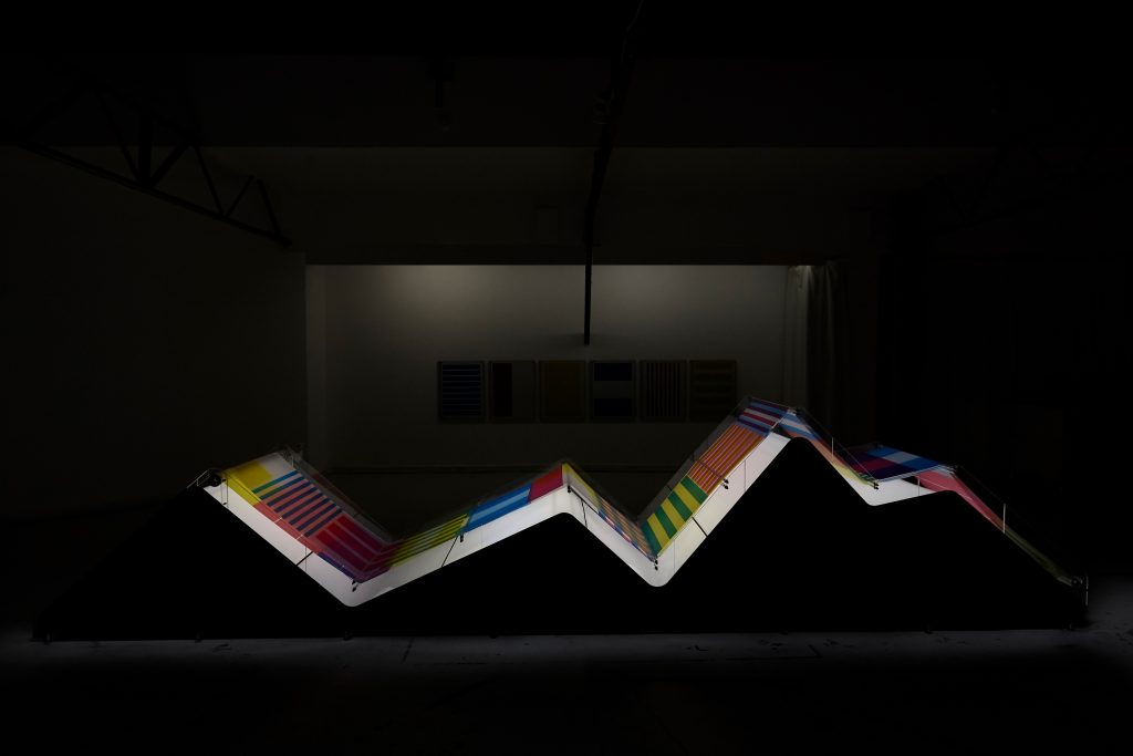 che creano un’esperienza spaziale immersiva. In mostra un’installazione interattiva attivata dal pubblico, due pareti sospese che attraversate dalla luce riproducono motivi colorati e una proiezione video dove le trame grafiche si compongono e scompongono in un gioco di combinazioni infinite.