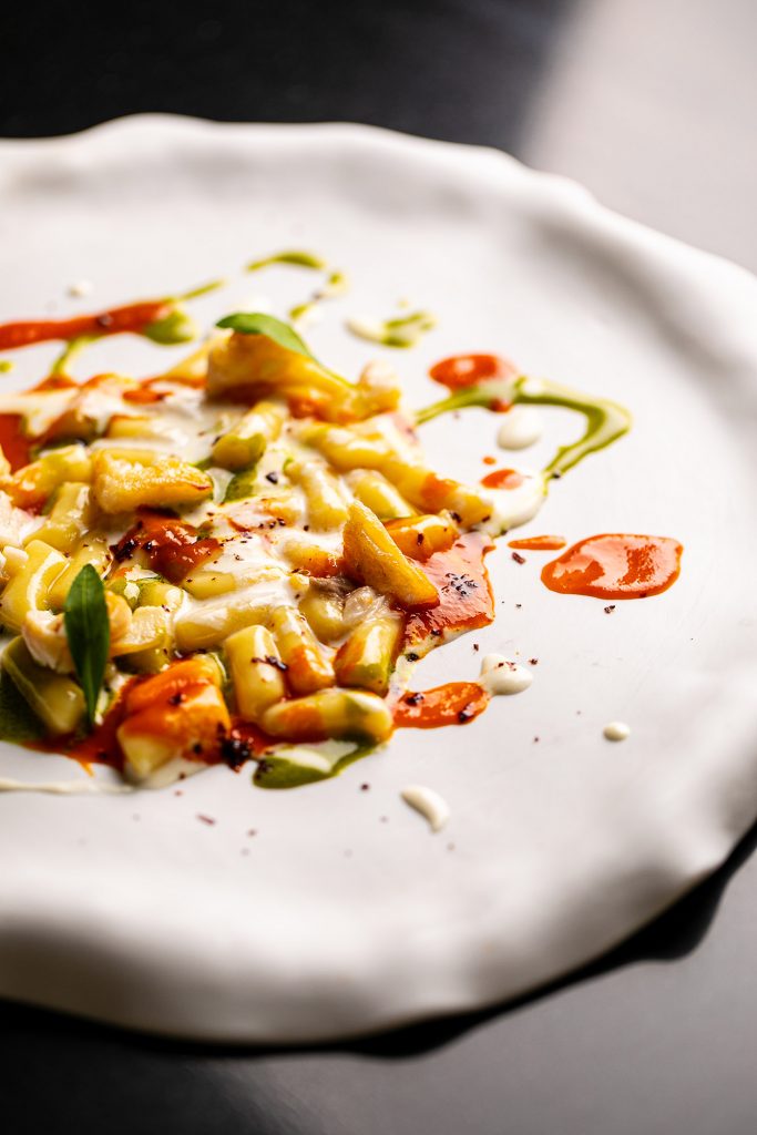 Il piatto è un primo di mare, composto da gnocco, black cod, peperone crusco, dragoncello, stracciatella e limone, ed è fortemente ispirato alle opere della corrente dell’espressionismo astratto e dell’action painting.