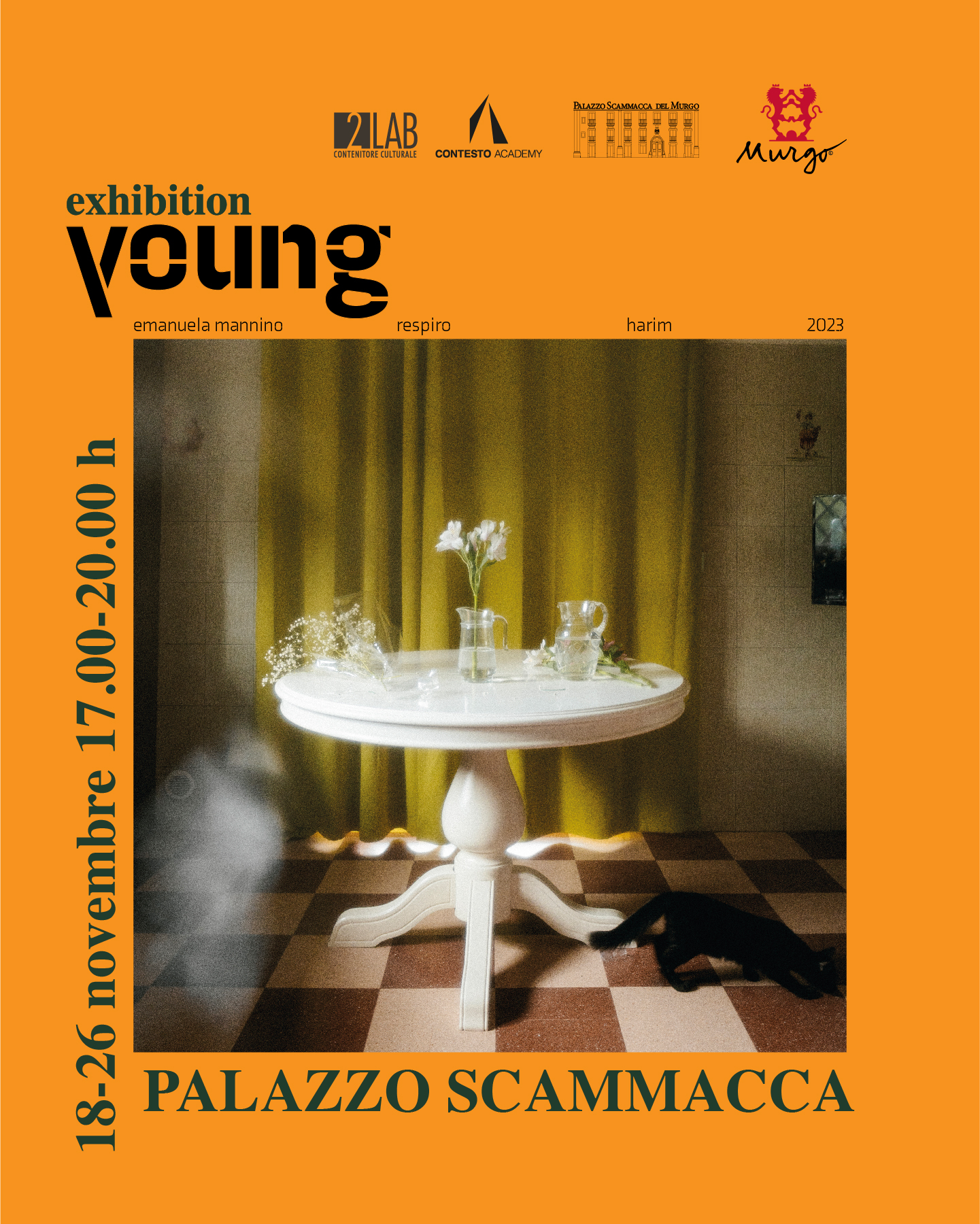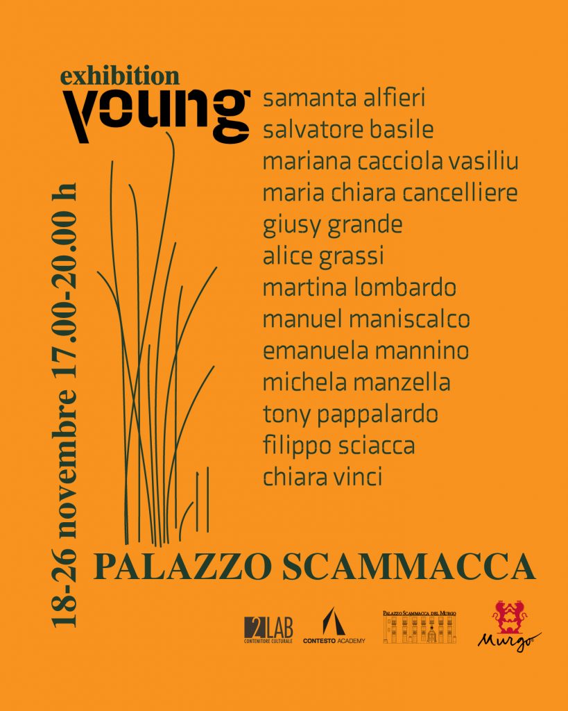 Negli spazi di Palazzo Scammacca, sabato 18 novembre alle ore 17.00 s’inaugura Young Exhibition, mostra collettiva degli studenti dell’Accademia di Belle Arti di Catania e dell’Harim, visitabile fino al 26 novembre. Saranno esposti i lavori di: Samanta Alfieri, Salvatore Basile, Mariana Cacciola Vasiliu, Maria Chiara Cancelliere, Giusy Grande, Alice Grassi, Martina Lombardo, Manuel Maniscalco, Emanuela Mannino, Michela Manzella, Tony Pappalardo, Filippo Sciacca, Chiara Vinci.